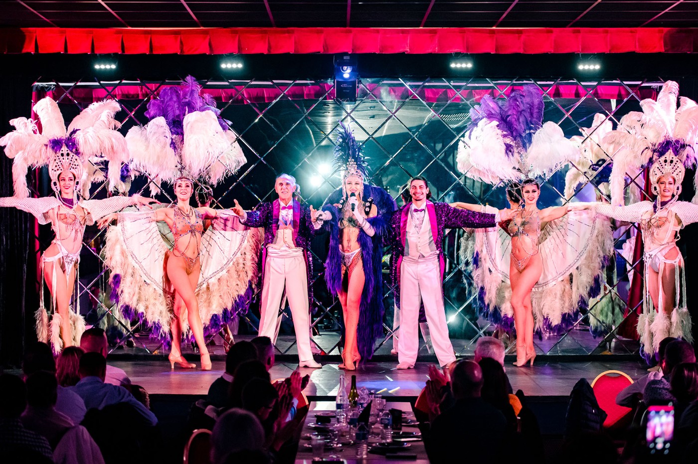 Menu servi au Réveillon 2025 (non contractuel pour 2026) : Apéritif d’accueil : 6 amuses-bouches Entrée : voyage autour du poisson avec de la Truite d’Acquigny fumée, Saumon mariné à l’aneth, Rillettes de cabillaud, Terrine de poisson sauce cocktail Prélude au plat : sorbet à la pomme, dès de pomme au sirop et Calvados Plats et accompagnements : grenadin de cerf, sauce grand veneur aux airelles ; fricassée de champignons et lardons ; pommes de terre grenailles aux épices. Fromage : Feuilleté de chèvre chaud, basilic, mesclun ; Dessert : dacquoise au chocolat, mousse à la fraise, Tapin pomme-poire, Bavarois mangue-passion ; café pur arabica et mignardises ainsi qu’une coupe de champagne à minuit, vin. Entre chaque plat, laissez-vous emporter par un spectacle haut en couleur: chansons françaises, humour, danse, plumes, strass (mais toujours avec goût !), le tout dans un esprit bon enfant, convivial et divertissant. Vous verrez un spectacle interactif dans un Tour du Monde éblouissant exécuté par 8 artistes entre ses chansons en direct et ses chorégraphies extrêmement rythmées, un pur bonheur. Vous découvrirez de nombreux tableaux riches en couleurs et émotions en 2h45. À l'approche des douze coups de minuit, les coupes de champagne se lèveront pour accueillir 2027 dans une ambiance joyeuse et festive. Cotillons, musiques de fête et bonne humeur seront au rendez-vous pour marquer ce moment si spécial. Après le spectacle, place à la musique pour ceux qui souhaitent danser ou simplement prolonger la soirée entre amis.